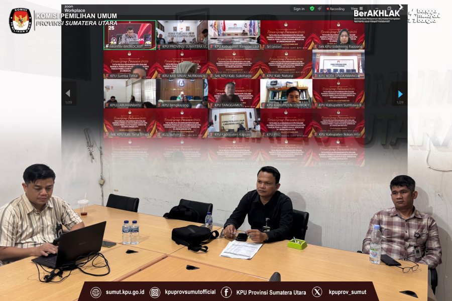 PU Provinsi Sumatera Utara (KPU Sumut) mengikuti Focus Group Disscussion (FGD) Tata Kelola Keuangan KPU Dalam rangka Penguatan Kelembagaan KPU Pasca Pemilu dan Pilkada Serentak yang digelar KPU secara hybrid, Senin (22/09/2025). Dalam sambutannya, Inspektur Utama KPU Nanang Priyatna menyampaikan bahwa pengelolaan keuangan dalam penyelenggaraan Pemilu dan Pilkada Serentak harus dilakukan secara tertib, taat pada ketentuan peraturan perundang-undangan yang dilaksanakan secara efektif, efisiensi, transparan dan akuntabel. Lebih lanjut Nanang mengatakan tata kelola keuangan sebagai daya dukung yang penting untuk suksesnya tahapan Pemilu dan Pilkada. Kegiatan ini diselenggarakan dari tanggal 22 s.d 24 September 2025 yang diikuti oleh 38 Sekretariat KPU Provinsi dan dan 514 Sekretariat KPU Kabupaten/Kota. Dari KPU Sumut mengikuti kegiatan ini secara daring yang dihadiri oleh Sekretaris, Kabag Keuangan Umum dan Logistik beserta Kasubbag keuangan dan staf pengelola keuangan. ....