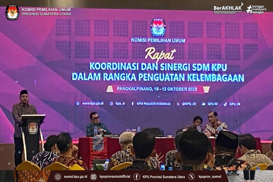 Anggota KPU Provinsi Sumatera Utara Robby Effendy dan Kepala Bagian yang membidangi Sumber Daya Manusia (SDM) Nina Purnama Pasaribu mengikuti Rapat Koordinasi dan Sinergi SDM KPU dalam rangka Penguatan Kelembagaan, Jumat (10/10/2025). Kegiatan yang diselenggarakan KPU RI ini digelar di Pangkal Pinang Provinsi Kepulauan Bangka Belitung, dari tanggal 10 s.d 12 Oktober 2025. Dalam sambutannya Ketua KPU RI Mochammad Afifuddin yang hadir bersama Anggota KPU RI, Idham Holik, Yulianto Sudrajat dan Parsadaan Harahap menyampaikan bahwa KPU telah berhasil menyelenggarakan Pemilu dan Pilkada Serentak 2024 secara profesional dan berintegritas. Afif menambahkan, dalam menyelenggarakan pemilu dan pilkada, KPU melihatnya sebagai tugas kemanusiaan, karena menjalankan aspek teknis kepemiluan dan juga berperan dalam mengelola potensi konflik sosial agar kehidupan masyarakat tetap harmonis pasca penyelenggaraan pemilu. Sementara itu, Idham Holik mengatakan bahwa penguatan kelembagaan KPU akan diteruskan ke seluruh jajaran KPU di tingkat Provinsi dan Kabupaten/Kota untuk menegaskan kembali visi, misi, serta tujuan penyelenggara pemilu. Disisi lain, Yulianto Sudrajat menambahkan KPU harus tetap berinovasi dengan melaksanakan kegiatan yang bermanfaat, seperti penyusunan jurnal dan karya tulis kepemiluan guna meningkatkan literasi demokrasi dan pendidikan pemilih. Diakhir kegiatan, Parsadaan Harahap menegaskan bahwa rakor ini salah satu upaya dalam menjaga keutuhan (soliditas) KPU sebagai penyelenggara Pemilu dan akan memperkuat kualitas SDM melalui berbagai program pelatihan dan pengembangan. Turut hadir dalam kegiatan ini Anggota KPU Provinsi dan Kepala Bagian yang membidangi SDM Se-Indonesia.