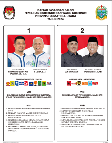 DAFTAR PASANGAN CALON PEMILIHAN GUBERNUR DAN WAKIL GUBERNUR PROVINSI SUMATERA UTARA TAHUN 2024 Jumat, 04 Oktober 2024 10:40 343 DAFTAR PASANGAN CALON PEMILIHAN GUBERNUR DAN WAKIL GUBERNUR PROVINSI SUMATERA UTARA TAHUN 2024 Baca Selengkapnya