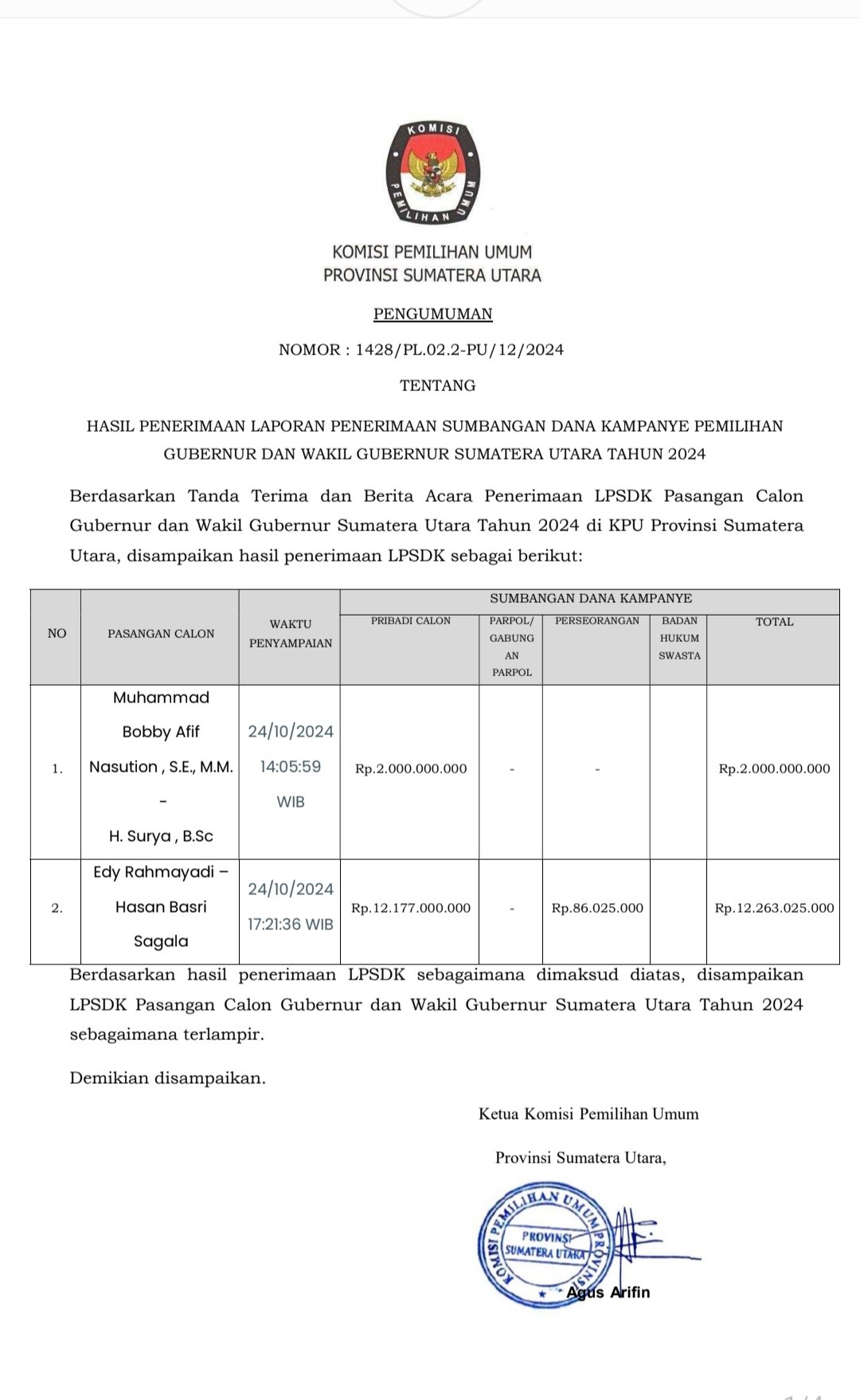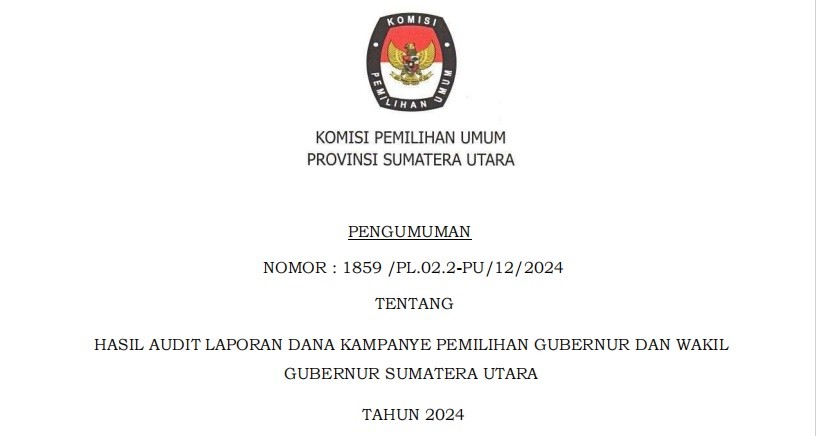 PENGUMUMAN TENTANG HASIL AUDIT LAPORAN DANA KAMPANYE PEMILIHAN GUBERNUR DAN WAKIL GUBERNUR SUMATERA UTARA TAHUN 2024 Kamis, 12 Desember 2024 12:00 325 DOWNLOAD DISINI Baca Selengkapnya