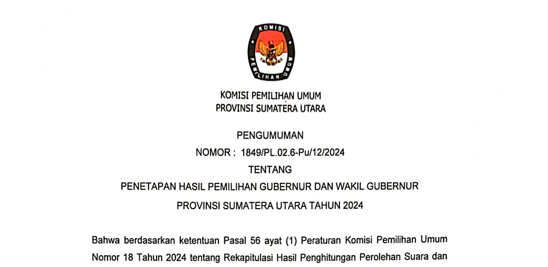 PENETAPAN PASANGAN CALON GUBERNUR DAN WAKIL GUBERNUR TERPILIH PROVINSI SUMATERA UTARA TAHUN 2024 Rabu, 05 Februari 2025 19:28 278 DOWNLOAD DISINI Baca Selengkapnya