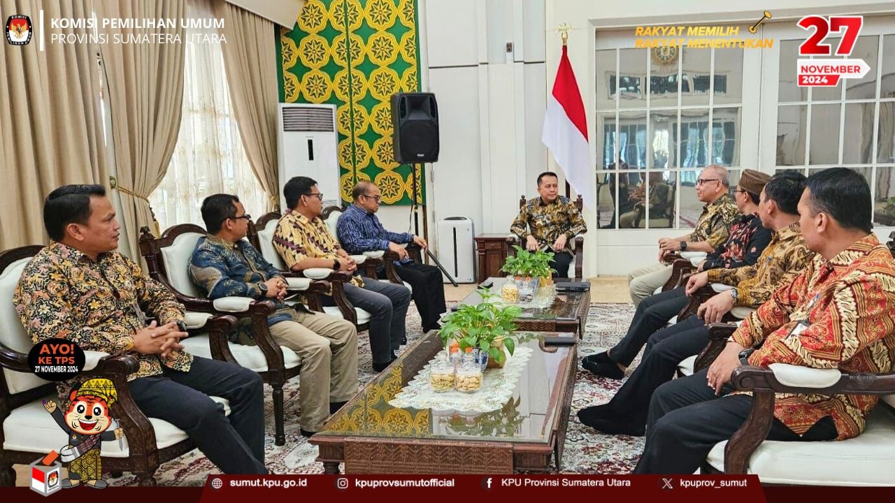 #TemanPemilih, KPU Provinsi Sumatera Utara melaksanakan audiensi dengan Pemerintah Provinsi Sumatera Utara terkait kesiapan melaksanakan Pilkada Serentak Tahun 2024 pada hari Jumat (04/10/2024) di Rumah Jabatan Gubernur Sumatera Utara.