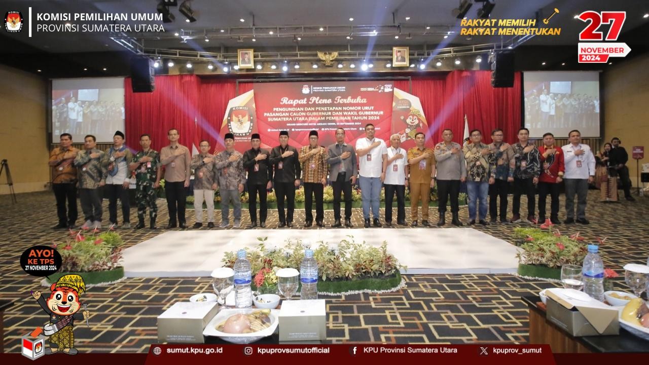 KPU Provinsi Sumatera Utara melaksanakan Rapat Pleno Terbuka Pengundian dan Penetapan Nomor Urut Pasangan Calon Gubernur dan Wakil Gubernur Sumatera Utara Tahun 2024 pada hari Senin (23/09/2024) di Hotel Grand Mercure Medan.