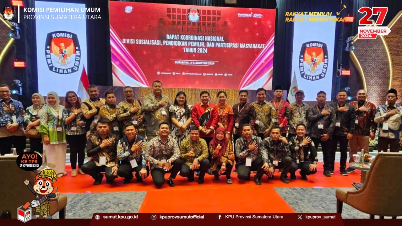 KPU Provinsi Sumatera Utara menghadiri rapat koordinasi (rakor) divisi sosialisasi, pendidikan pemilih, dan partisipasi masyarakat (sosdiklih dan parmas) yang dilaksanakan pada tanggal 4 s.d 6 Agustus 2024 di Vasa Hotel Surabaya.