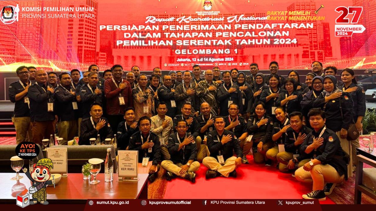 KPU Provinsi Sumatera Utara menghadiri Rapat Koordinasi Nasional (Rakornas) Persiapan Penerimaan Pendaftaran dalam Tahapan Pencalonan Pemilihan Serentak Tahun 2024 yang dilaksanakan pada tanggal 12 - 14 Agustus 2024 di Jakarta.