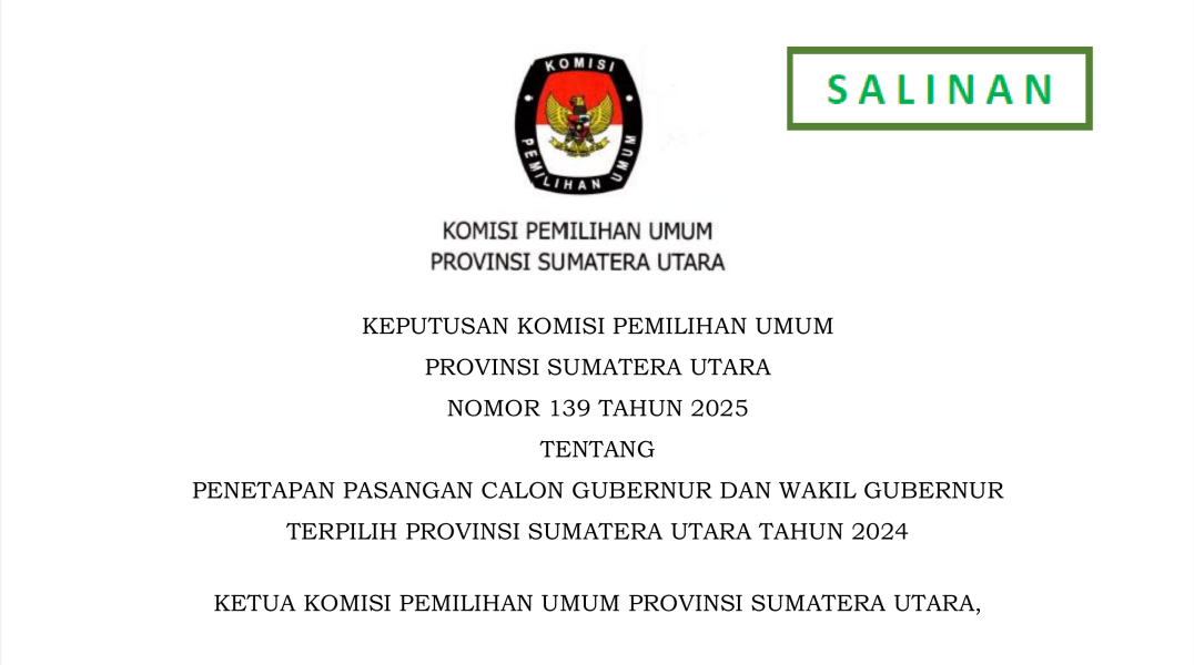 PENETAPAN PASANGAN CALON GUBERNUR DAN WAKIL GUBERNUR TERPILIH PROVINSI SUMATERA UTARA TAHUN 2024 Rabu, 05 Februari 2025 19:28 277 DOWNLOAD DISINI Bagikan: Telah dilihat 277 kali