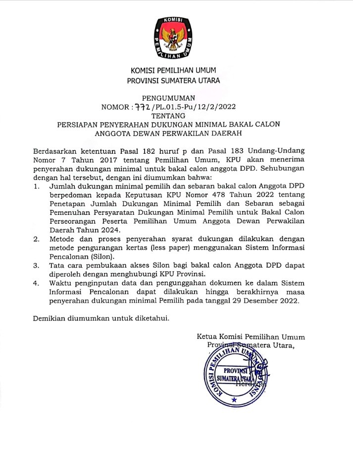 Pengumuman Penyerahan Dukungan Minimal Bakal Calon Anggota Dewan Perwakilan Daerah