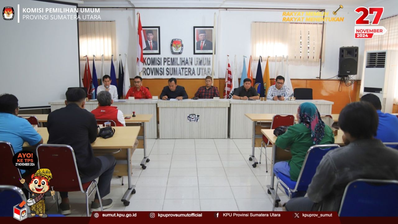 KPU Provinsi Sumatera Utara melaksanakan penyampaian hasil penelitian persyaratan administrasi Calon Gubernur dan Wakil Gubernur Sumatera Utara Tahun 2024 di Aula Kantor KPU Provinsi Sumatera Utara pada hari Kamis (05/09/2024).