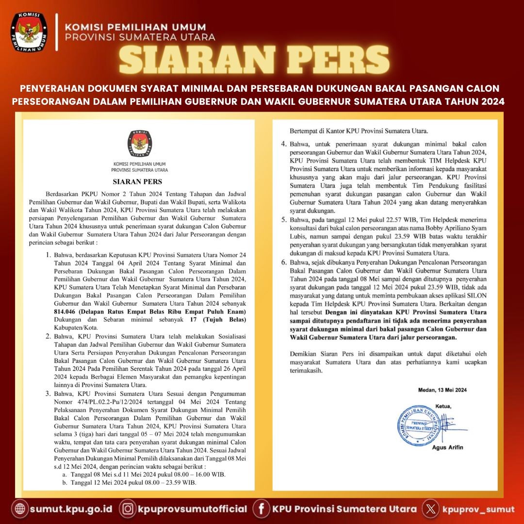 Penyerahan Dokumen Syarat Minimal dan Persebaran Dukungan Bakal Calon Perseorangan dalam Pemilihan Gubernur dan Wakil Gubernur Sumatera Utara Tahun 2024 Senin, 13 Mei 2024 00:15 37 LINK DOWNLOAD Bagikan: Telah dilihat 37 kali