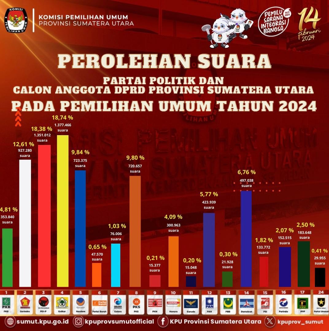 Perolehan Suara Partai Politik dan Calon Anggota DPRD Provinsi Sumatera Utara Pemilu Tahun 2024
