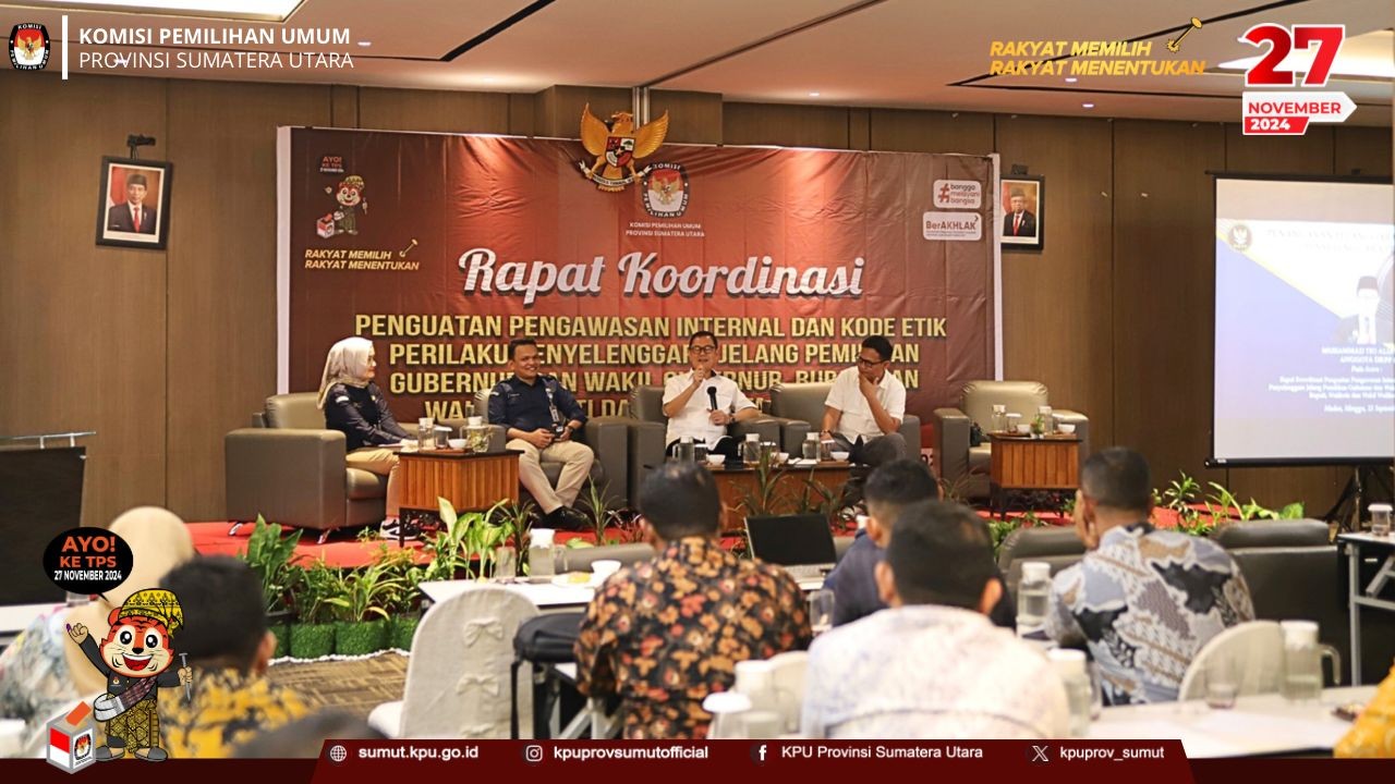 KPU Provinsi Sumatera Utara menggelar rapat koordinasi (rakor) penguatan pengawasan internal dan kode etik perilaku penyelenggara jelang Pemilihan Gubernur dan Wakil Gubernur, Bupati dan Wakil Bupati dan Walikota dan Wakil Walikota Tahun 2024 pada hari Minggu (15/09/2024) di Grand Mercure Maha Cipta Medan Angkasa.