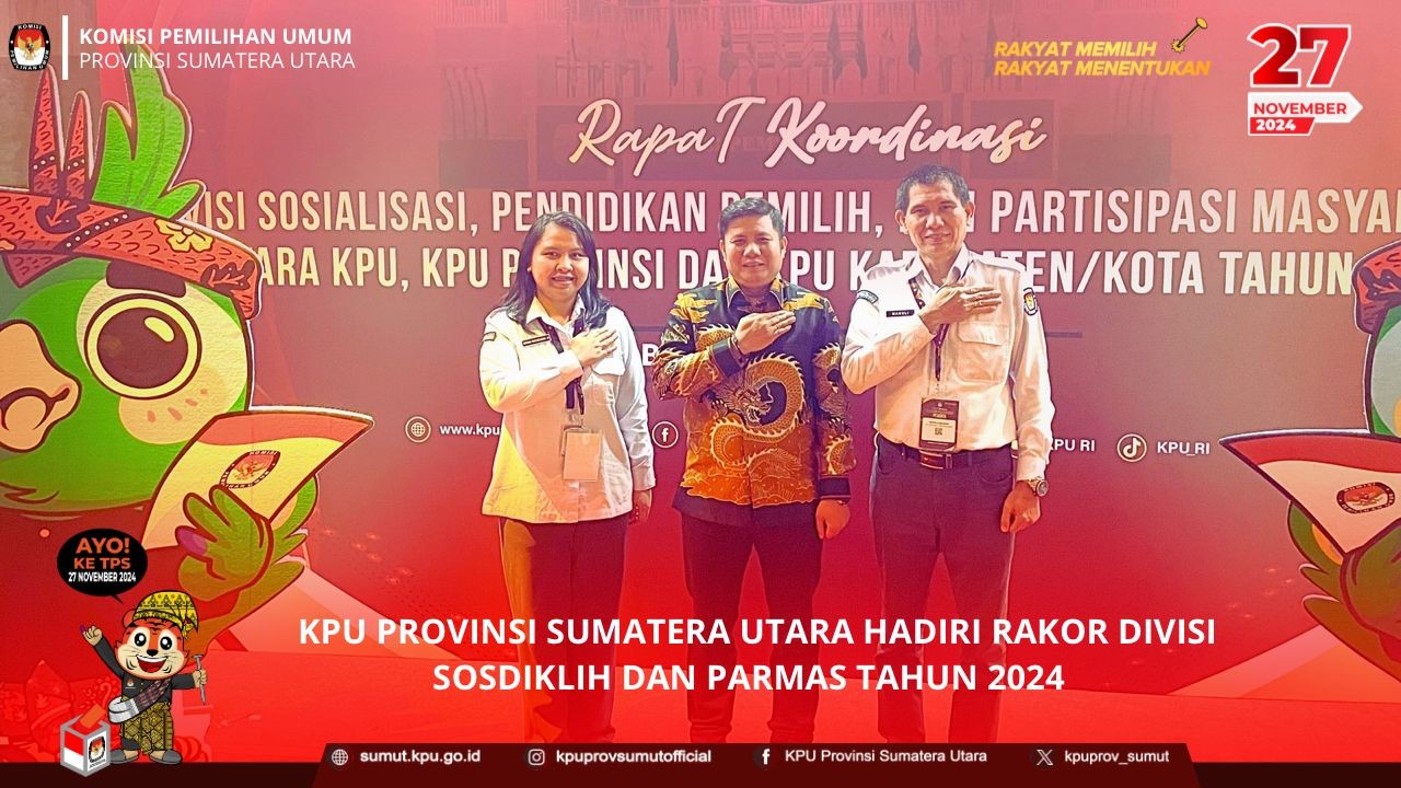 KPU Provinsi Sumatera Utara menghadiri rapat koordinasi (rakor) divisi sosialisasi, pendidikan pemilih, dan partisipasi masyarakat (sosdiklih dan parmas) yang dilaksanakan pada tanggal 4 s.d 6 Agustus 2024 di Vasa Hotel Surabaya.