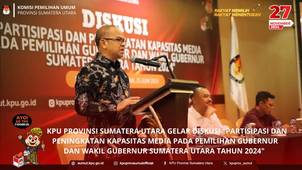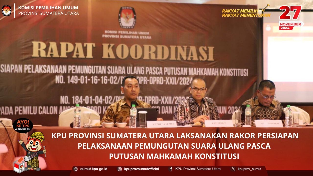KPU Provinsi Sumatera Utara melaksanakan rapat koordinasi (rakor) persiapan pelaksanaan Pemungutan Suara Ulang pasca Putusan Mahkamah Konstitusi Nomor 149-01-16-02/PHPU.DPR-DPRD-XXII/2024 dan 184-01-04-02/PHPU.DPR-DPRD- XXII/2024 pada Pemilihan Umum Calon Anggota DPRD Kabupaten Nias Selatan dan Samosir Tahun 2024 pada hari Jumat (21/06/2024) di Hotel Grand City Hall Medan.