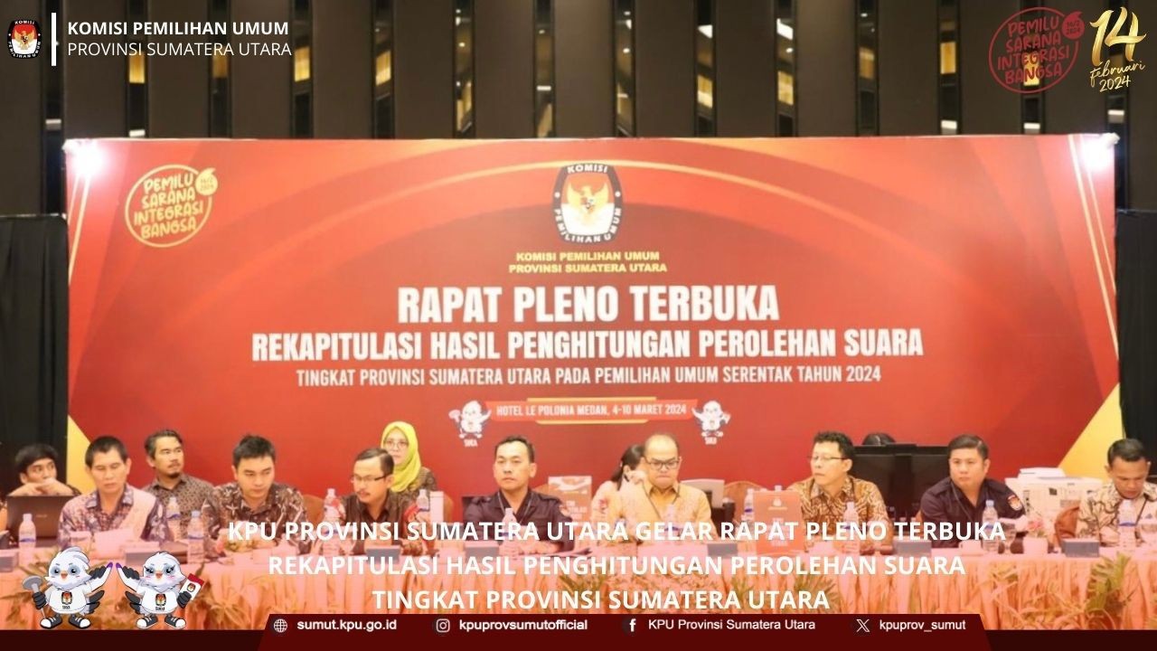 TemanPemilih, KPU Provinsi Sumatera Utara menggelar Rapat Pleno Terbuka Rekapitulasi Hasil Penghitungan Perolehan Suara Tingkat Provinsi Sumatera Utara Pada Pemilihan Umum (Pemilu) Serentak Tahun 2024 di Hotel LePolonia Medan, Senin - Minggu (4/3 – 10/3/2024).