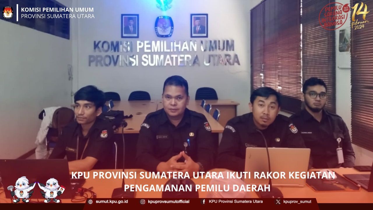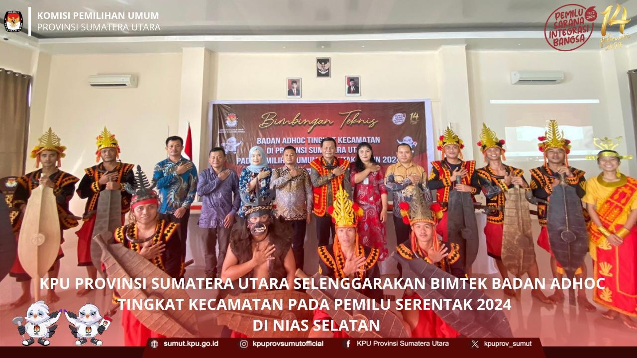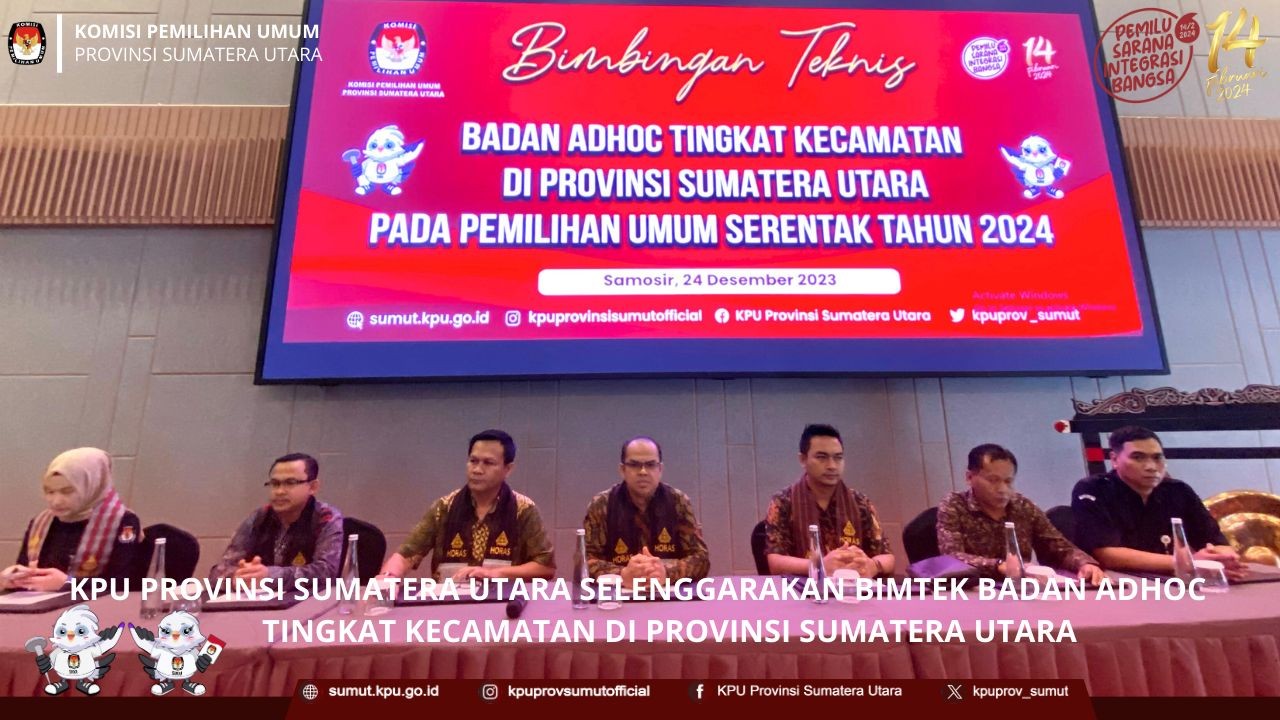 KPU Provinsi Sumatera Utara menyelenggarakan bimbingan teknis (bimtek) badan adhoc tingkat kecamatan di Provinsi Sumatera Utara pada Pemilihan Umum (Pemilu) Serentak 2024 pada hari Minggu (24/12/2023) di Marina Hotel Samosir, yang diikuti oleh Anggota KPU Kabupaten/Kota yang membidangi Divisi SDM, Kasubbag SDM, dan PPK KPU Kabupaten/Kota yang terdiri dari KPU Kabupaten Mandailing Natal, Kota Padang Sidempuan, Kabupaten Tapanuli Selatan, Kabupaten Padang Lawas, dan Kabupaten Padang Lawas Utara.