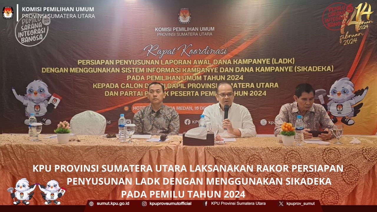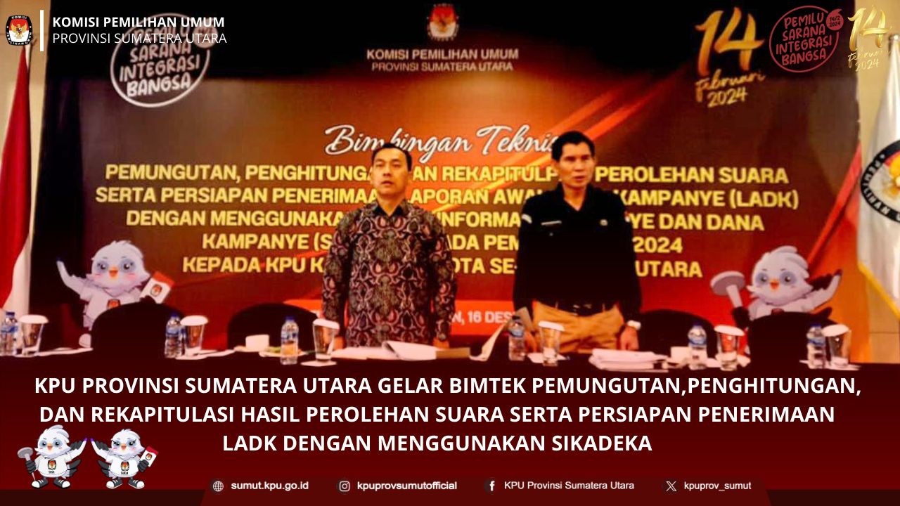 KPU Provinsi Sumatera Utara menggelar Bimbingan Teknis (Bimtek) Pemungutan, Penghitungan, dan Rekapitulasi Hasil Perolehan Suara serta Persiapan Penyusunan Laporan Awal Dana Kampanye (LADK) Dengan Menggunakan Sistem Informasi Kampanye dan Dana Kampanye (SIKADEKA) Pada Pemilihan Umum (Pemilu) Tahun 2024 kepada KPU Kabupaten/Kota Se-Sumatera Utara di Hotel JW Marriott Medan pada hari Sabtu (16/12/2023).