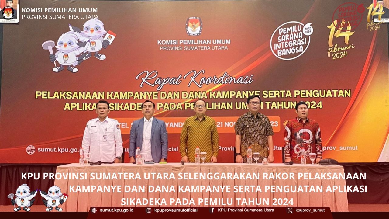 KPU Provinsi Sumatera Utara menyelenggarakan Rapat Koordinasi (Rakor) pelaksanaan kampanye dan dana kampanye serta penguatan aplikasi SIKADEKA (Sistem Informasi Kampanye dan Dana Kampanye) pada Pemilu Tahun 2024 di Hotel Santika Dyandra Medan yang dilaksanakan pada tanggal 20 - 21 November 2023, yang diikuti oleh Anggota KPU Divisi Teknis Penyelenggaraan Pemilu, Anggota KPU Divisi SDM dan Parmas, Kasubbag Teknis dan Parhubmas, dan Admin/Operator SIKADEKA KPU Kabupaten/Kota Se-Sumatera Utara.