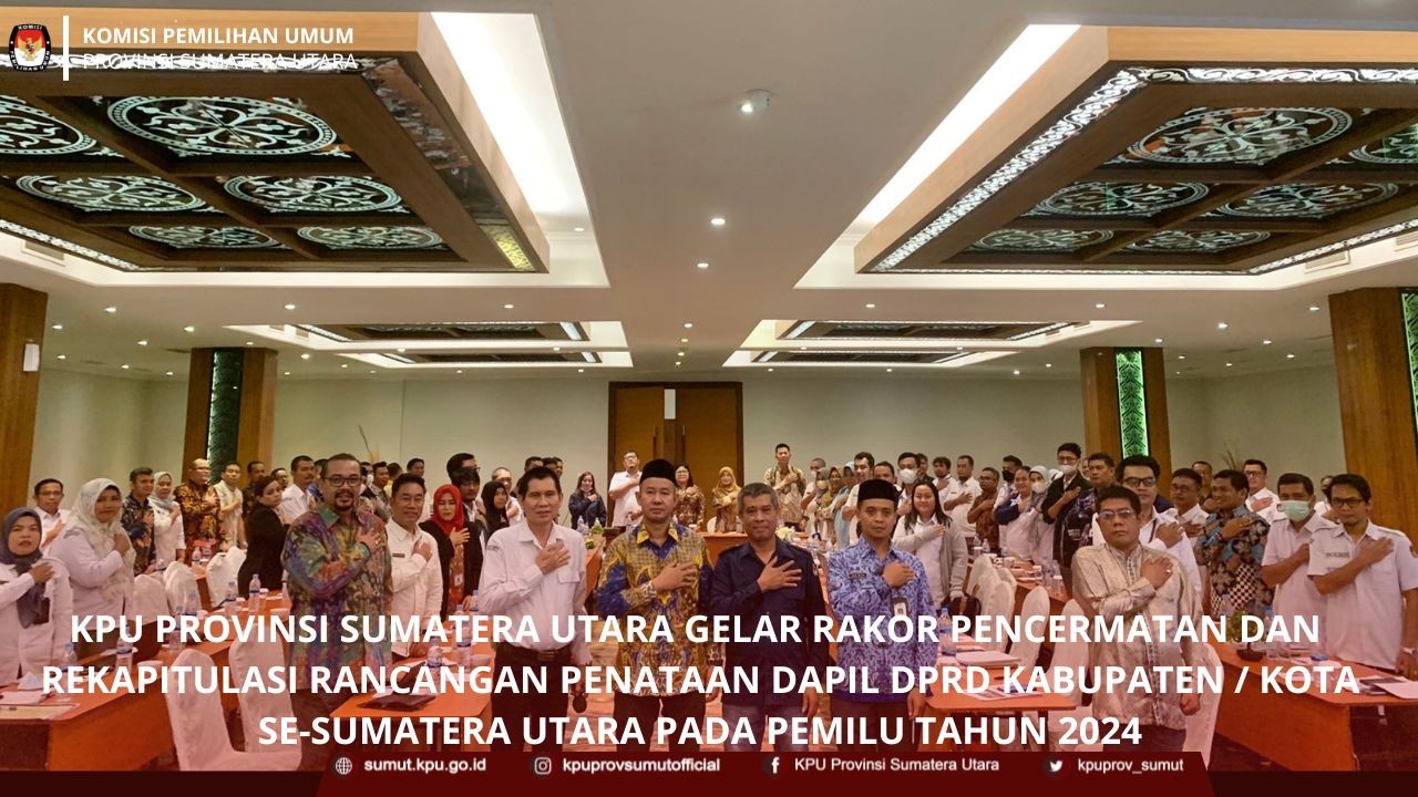 Rapat Koordinasi Pencermatan dan Rekapitulasi Rancangan Pentaan Dapil DPRD Kabupaten/Kota Se-Sumatera Utara KPU Provinsi Sumatera Utara menggelar Rapat Koordinasi (Rakor) Pencermatan dan Rekapitulasi Rancangan Penataan Dapil DPRD Kabupaten/Kota Se-Sumatera Utara Pada Pemilu Tahun 2024, yang dilaksanakan pada tanggal 22-23 Desember 2022 di Le Polonia Hotel Medan. Rakor ini secara resmi dibuka oleh Herdensi Ketua KPU Provinsi Sumatera Utara, dan didampingi oleh Batara Manurung Anggota KPU Provinsi Sumatera Utara, Maruli Pasaribu Kabag Teknis Penyelenggaraan Pemilu, Partisipasi dan Hubungan Masyarakat, dan Agus Kasubbag Teknis Penyelenggaraan Pemilu. "KPU Provinsi Sumatera Utara sesuai dengan ketentuan ditugaskan untuk melakukan pencermatan penataan dapil DPRD Kabupaten/Kota, untuk itu KPU Kabupaten/Kota diundang oleh KPU Provinsi Sumatera Utara untuk dapat memberikan masukan kepada KPU Provinsi Sumatera Utara dalam pencermatan penataan dapil dimaksud", papar Herdensi. Pada rakor ini disampaikan agar KPU Kabupaten/Kota mempresentasikan tiap rancangan dapil dari hasil uji publik yang telah mereka lakukan dengan mengundang partai politik, tokoh masyarakat, tokoh adat, maupun akademisi. Rakor ini diikuti oleh Koordiv Teknis Penyelenggaraan Pemilu, Kasubbag Teknis Penyelenggaraan Pemilu, dan Admin/Operator Sidapil KPU Kabupaten/Kota Se-Sumatera Utara.