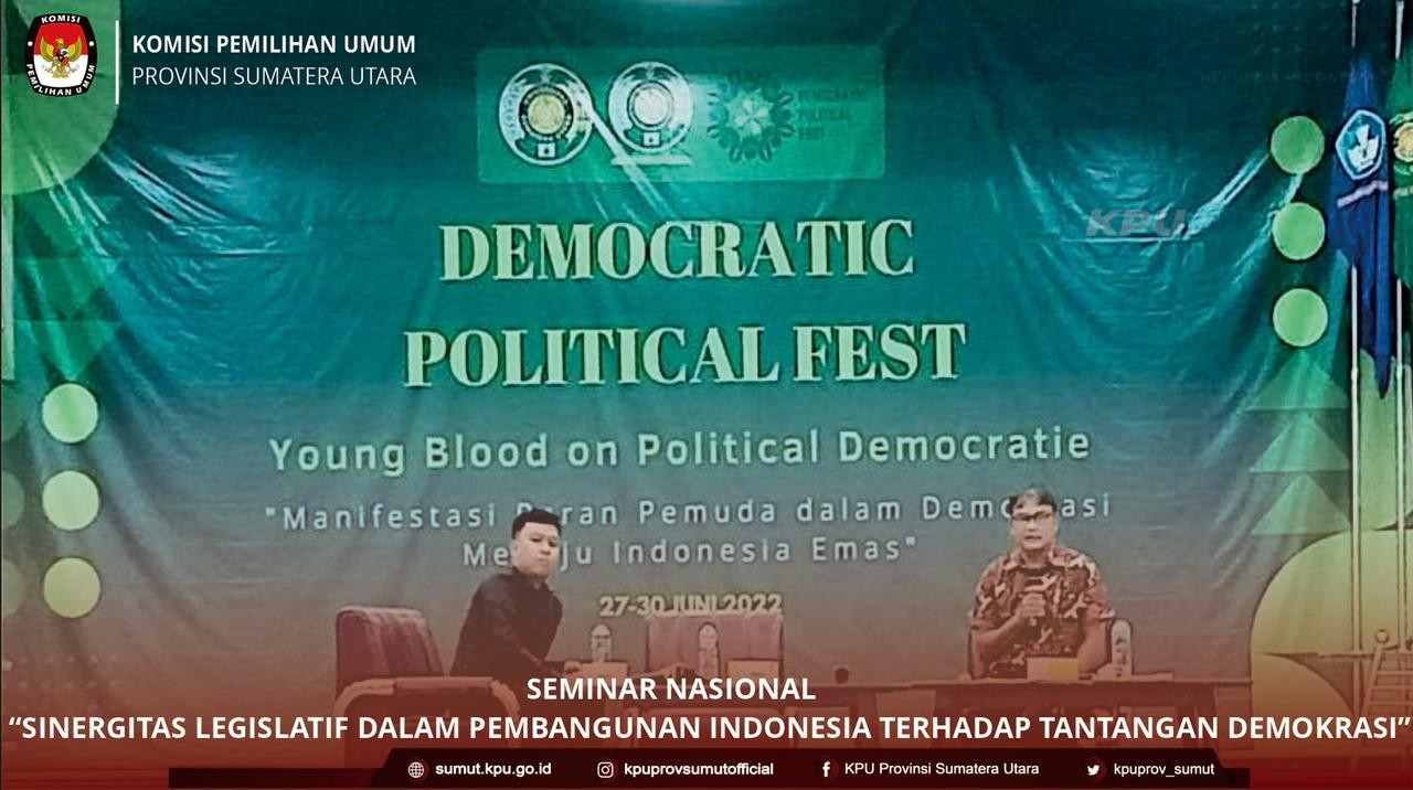 KPU Provinsi Sumatera Utara Hadiri Seminar Nasional Democratic Political Fest di Universitas Sumatera Utara KPU Provinsi Sumatera Utara-Medan, Anggota KPU Provinsi Sumatera Utara Benget Manahan Silitonga hadir sebagai Narasumber di Seminar Nasional "Sinergitas Legislatif dalam Pembangunan Indonesia terhadap Tantangan Demokrasi" pada acara Democratic Political Fest Universitas Sumatera Utara (USU) yang diselenggarakan di Gelanggang Mahasiswa USU pada hari Senin (27/06/2022). Pada kesempatannya Benget menyampaikan bahwa Pemilu 2024 yang berintegritas dapat diwujudkan asalkan adanya pemilih yang berintegritas. “Pemilu 2024 yang berintegritas bisa diwujudkan, salah satunya dengan ketersediaan pemilih yang berintegritas. Pemilih berintegritas adalah pemilih yang rasional dan mandiri yang mampu menolak politik uang, pro aktif mencari profil atau track record kandidat, memilih berdasar visi/misi dan program kandidat, serta berpartisipasi aktif dalam tahapan pemilu 2024,” ujar Benget. Benget juga menambahkan untuk mendorong ketersediaan pemilih yang berintegritas tentunya dibutuhkan peran serta atau keterlibatan para pemangku kepentingan dari masyarakat sipil, khususnya Universitas atau Perguruan Tinggi, Organisasi Kemahasiswaan dan juga Lembaga Sekolah untuk melakukan sosialisasi dan pendidikan pemilih kepada para pemilih muda dan pemilih pemula yang berdasarkan data Pemilu 2019 jumlahnya cukup signifikan. Peserta pada kegiatan ini merupakan perwakilan mahasiswa yang berada di Pemerintahan Mahasiswa USU dan Organisasi Intra Kampus. Acara ini di akhiri dengan pemberian cinderamata dari pihak rektorat USU kepada KPU Provinsi Sumatera Utara (MN)