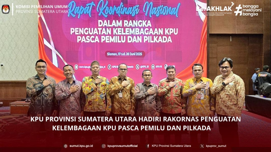 KPU Provinsi Sumatera Utara menghadiri rapat koordinasi nasional (rakornas) untuk penguatan kelembagaan KPU pasca Pemilu dan Pilkada yang dilaksanakan pada tanggal 17 - 20 Juni 2025 di Yogyakarta. Pada sambutannya, Ketua KPU RI Mochammad Afifuddin yang hadir bersama Anggota KPU Yulianto Sudrajat, August Mellaz, Iffa Rosita, Parsadaan Harahap, dan Idham Holik serta Sekretaris Jenderal KPU Bernad Dermawan Sutrisno, menyampaikan bahwa KPU segera merumuskan program kegiatan pasca Pemilu dan Pilkada 2024. Selain berasal dari program divisi, KPU juga menerima masukan dari KPU provinsi dan kabupaten/kota. Pembukaan rakornas diisi dengan materi dari narasumber Prof. Dr. Ari Darmastuti (Guru Besar Universitas Lampung), Maharani, S.E, M.B.A. (Kementerian PPN/Bappenas) dan paparan draft Renstra oleh Mashur Sampurna Jaya (Kepala Biro Perencanaan dan Organisasi KPU RI). Dari KPU Provinsi Sumatera Utara dihadiri oleh Ketua, Anggota, serta Sekretaris KPU Provinsi Sumatera Utara.