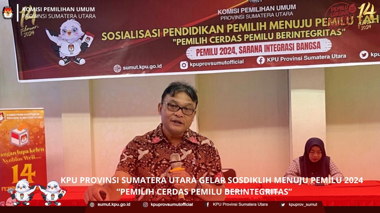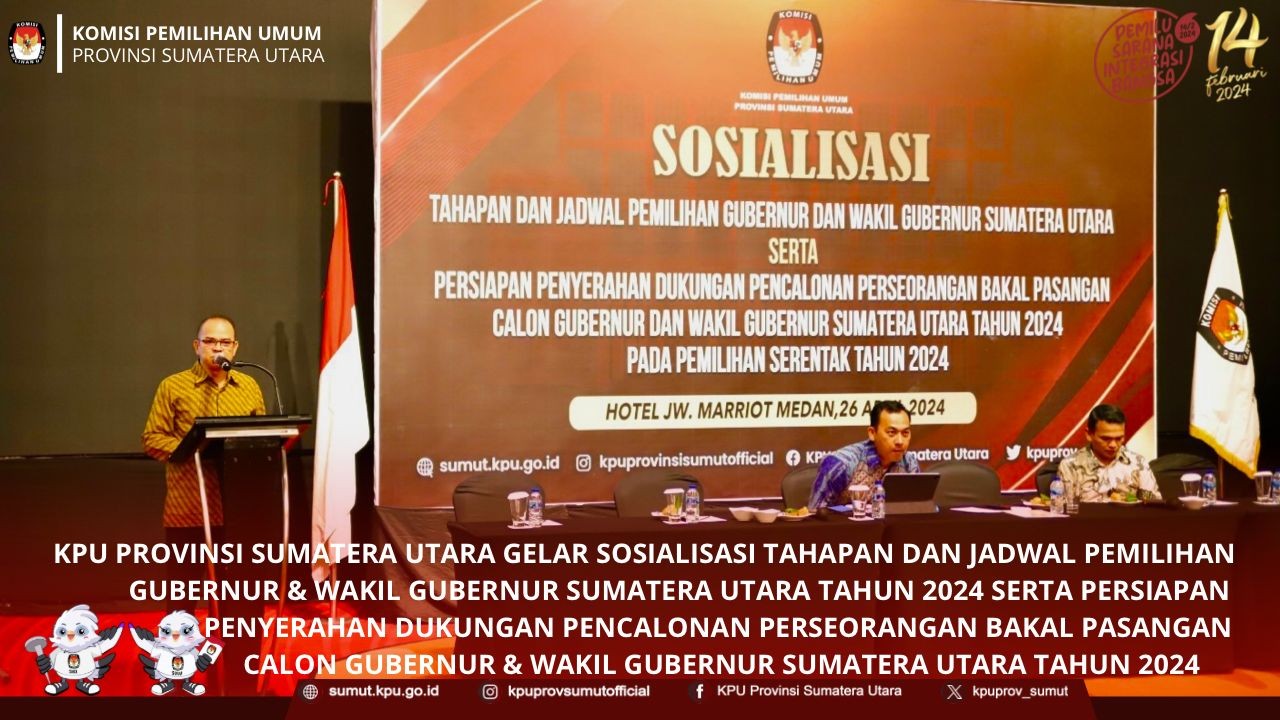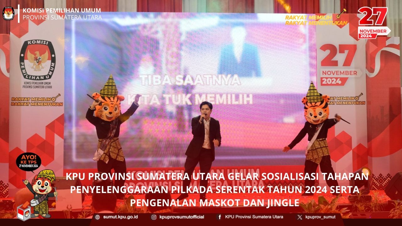KPU Provinsi Sumatera Utara menggelar Sosialisasi Tahapan Penyelenggaraan Pilkada Serentak Tahun 2024 serta Pengenalan Maskot dan Jingle pada Pemilihan Gubernur dan Wakil Gubernur Sumatera Utara Tahun 2024 pada hari Jumat (14/06/2024) di Hotel Santika Dyandra Medan Medan.