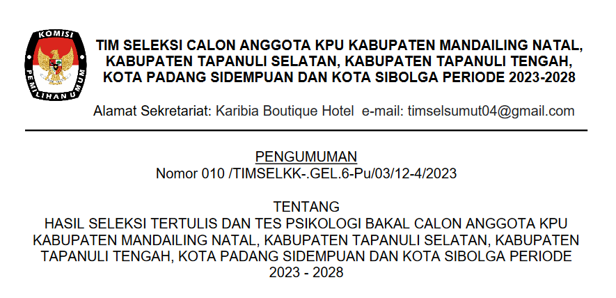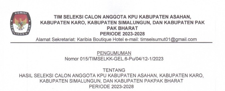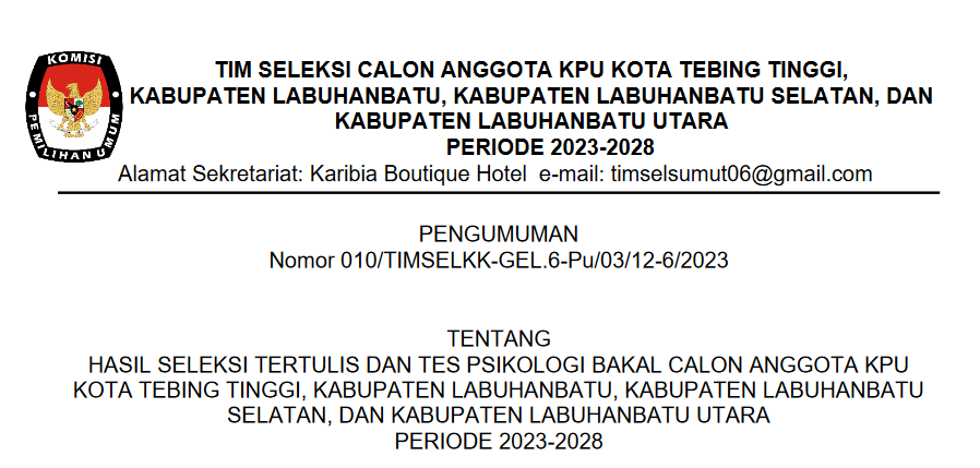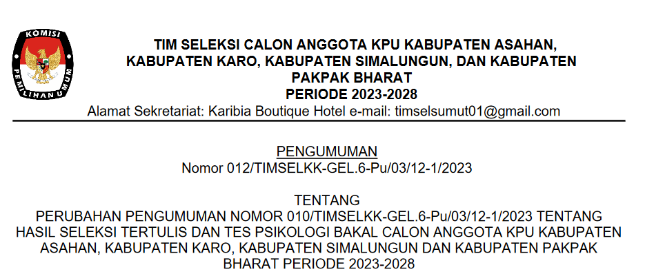 PERUBAHAN PENGUMUMAN NOMOR 010/TIMSELKK-GEL.6-Pu/03/12-1/2023 HASIL SELEKSI TERTULIS DAN TES PSIKOLOGI BAKAL CALON ANGGOTA KPU ASAHAN, KARO, SIMALUNGUN DAN PAKPAK BHARAT PERIODE 2023-2028 Rabu, 19 Juli 2023 23:58 707 LINK DOWNLOAD Baca Selengkapnya