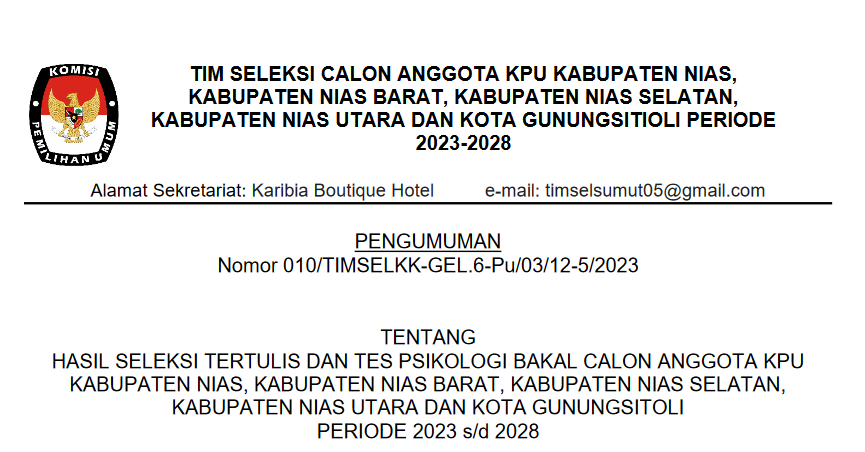 HASIL SELEKSI TERTULIS DAN TES PSIKOLOGI BAKAL CALON ANGGOTA KPU KABUPATEN NIAS, KABUPATEN NIAS BARAT, KABUPATEN NIAS SELATAN, KABUPATEN NIAS UTARA DAN KOTA GUNUNGSITOLI PERIODE 2023 s/d 2028 Senin, 17 Juli 2023 20:00 874 LINK DOWNLOAD Baca Selengkapnya