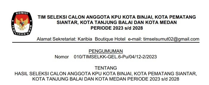 HASIL SELEKSI CALON ANGGOTA KPU KOTA BINJAI, KOTA PEMATANG SIANTAR, KOTA TANJUNG BALAI DAN KOTA MEDAN PERIODE 2023 s/d 2028 Sabtu, 29 Juli 2023 22:19 322 LINK DOWNLOAD Baca Selengkapnya
