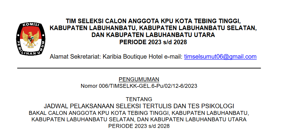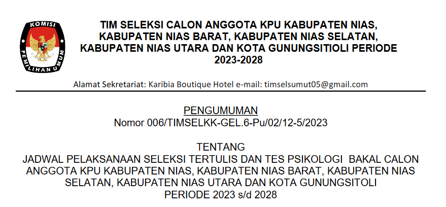 JADWAL PELAKSANAAN SELEKSI TERTULIS DAN TES PSIKOLOGI BAKAL CALON ANGGOTA KPU NIAS, NIAS BARAT, NIAS SELATAN,NIAS UTARA DAN GUNUNGSITOLI PERIODE 2023 s/d 2028 Rabu, 05 Juli 2023 23:58 312 LINK DOWNLOAD Baca Selengkapnya