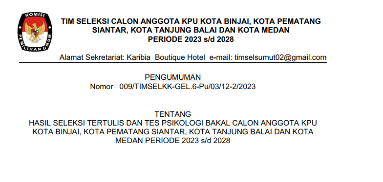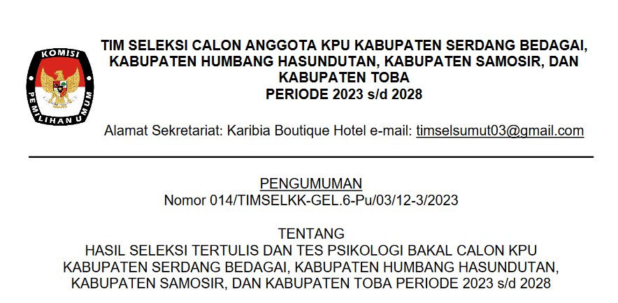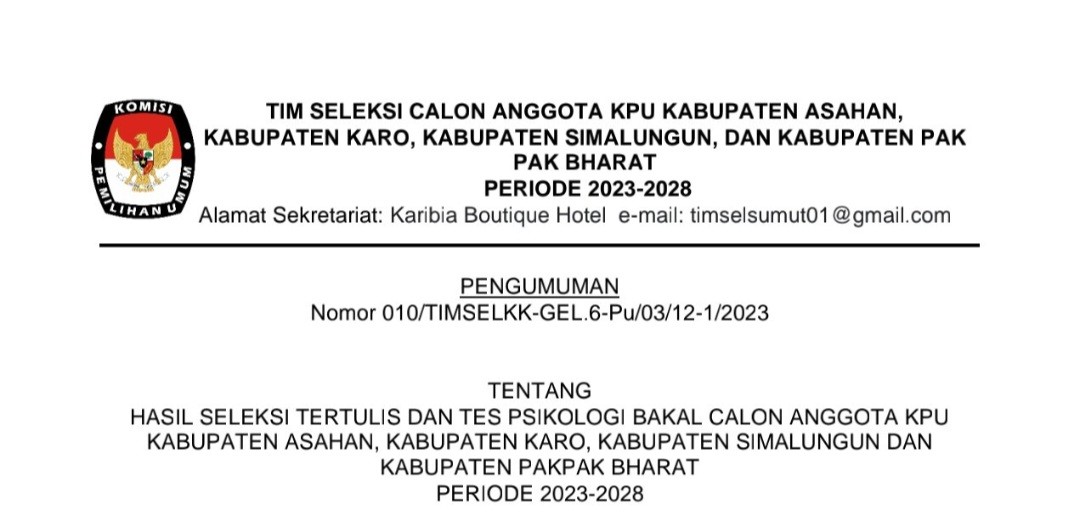 HASIL SELEKSI TERTULIS DAN TES PSIKOLOGI BAKAL CALON ANGGOTA KPU ASAHAN, KARO, SIMALUNGUN DAN PAKPAK BHARAT PERIODE 2023-2028 Senin, 17 Juli 2023 19:40 168 LINK DOWNLOAD Baca Selengkapnya
