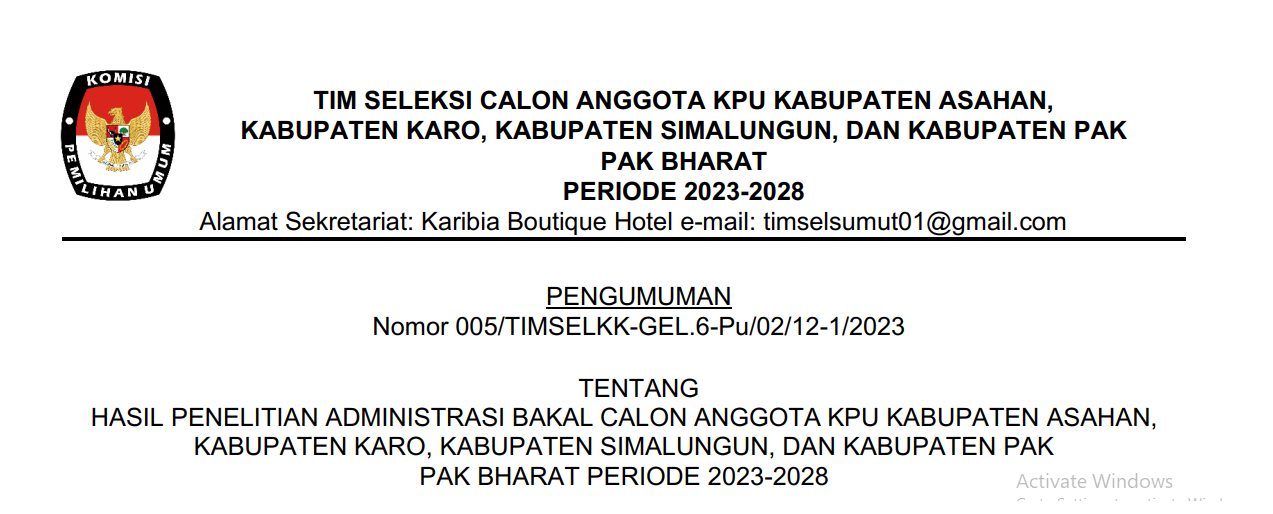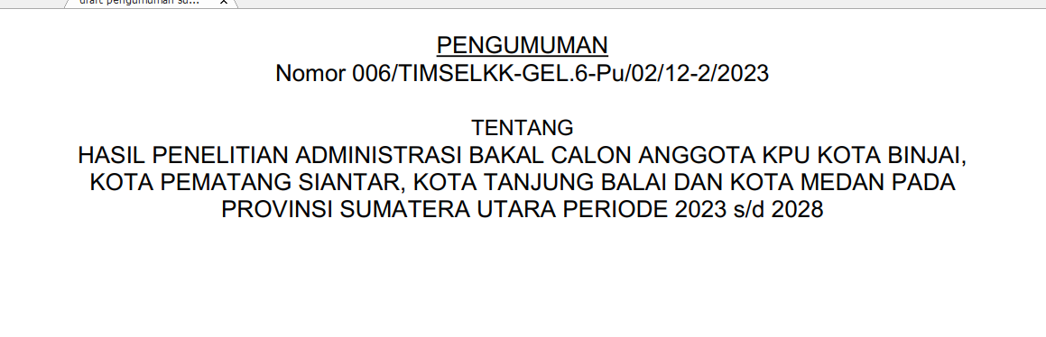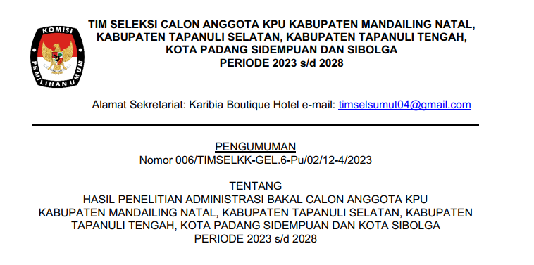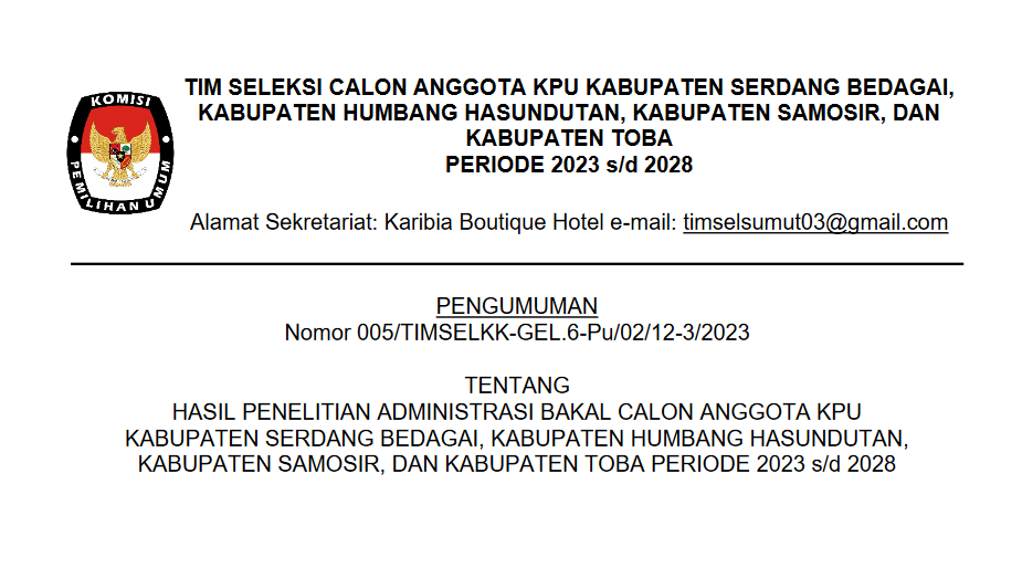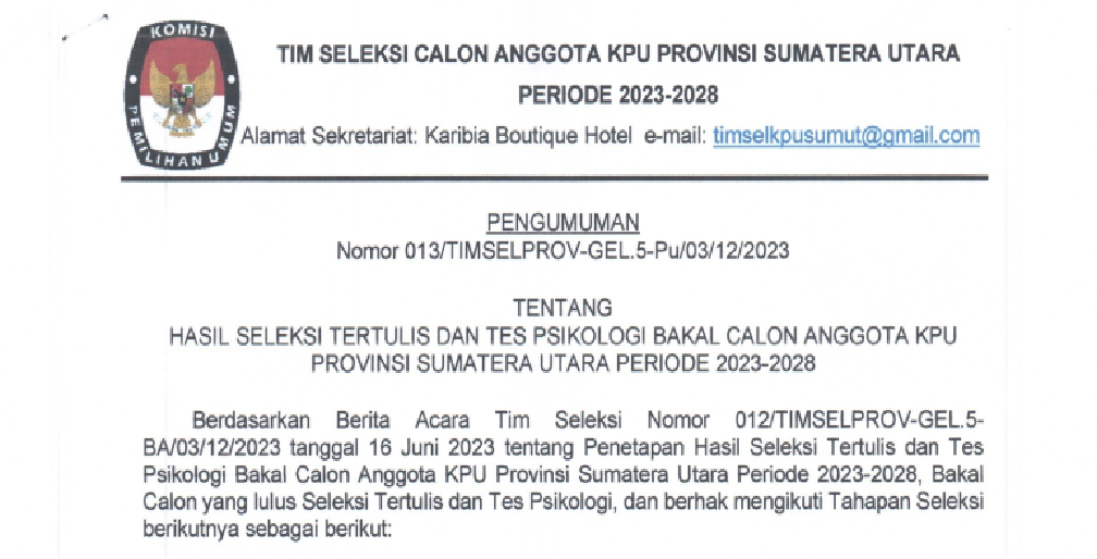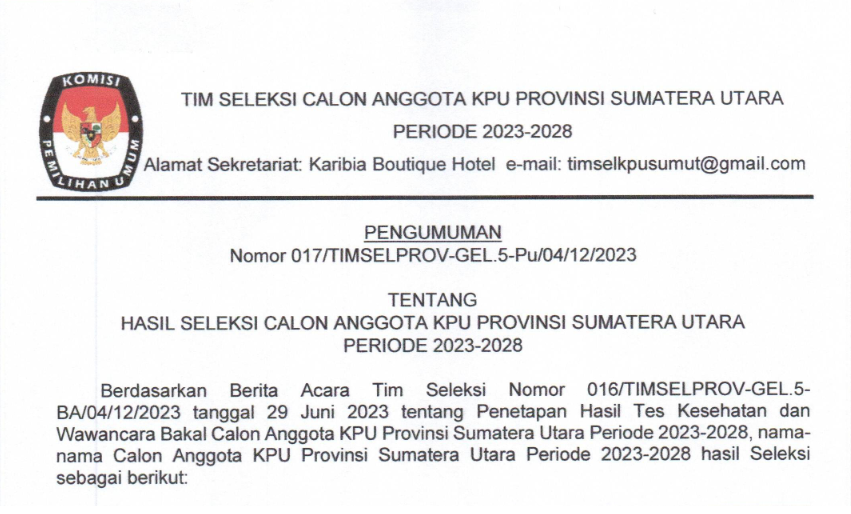 PENGUMUMAN HASIL SELEKSI CALON ANGGOTA KPU PROVINSI SUMATERA UTARA PERIODE 2023-2028 Kamis, 29 Juni 2023 23:31 1396 LINK DOWNLOAD Baca Selengkapnya
