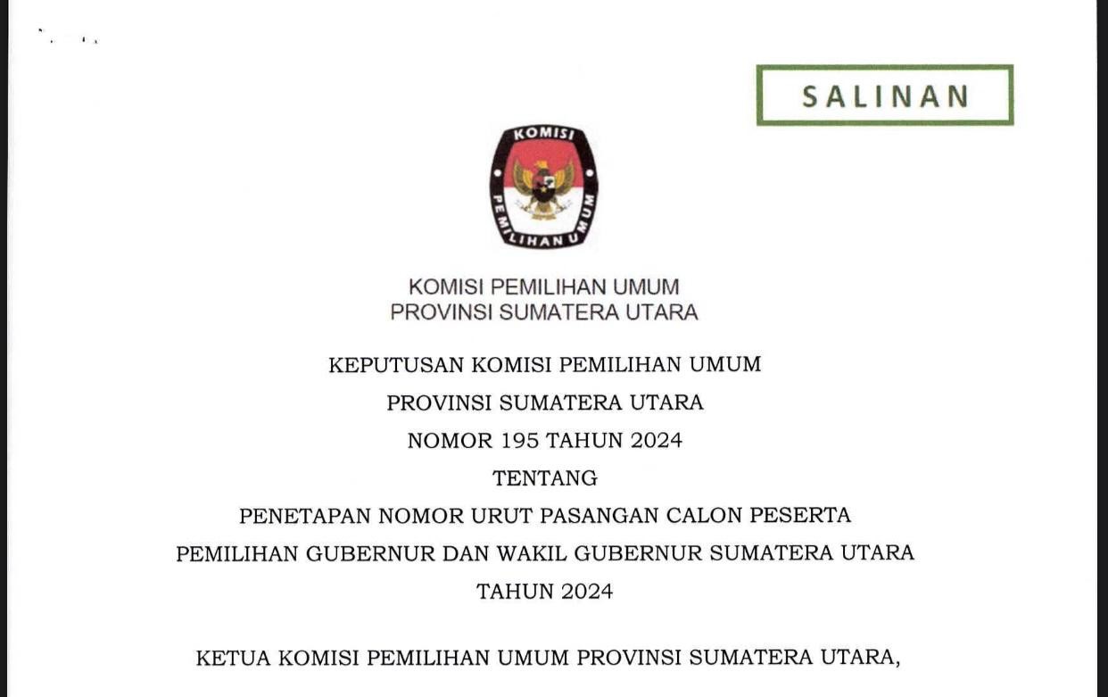 Keputusan Komisi Pemilihan Umum Provinsi Sumatera Utara Nomor 195 Tahun 2024 Tentang Penetapan Nomor Urut Pasangan Calon Peserta Pemilihan Gubernur dan Wakil Gubernur Sumatera Utara Selasa, 24 September 2024 09:45 115 LINK DOWNLOAD Baca Selengkapnya