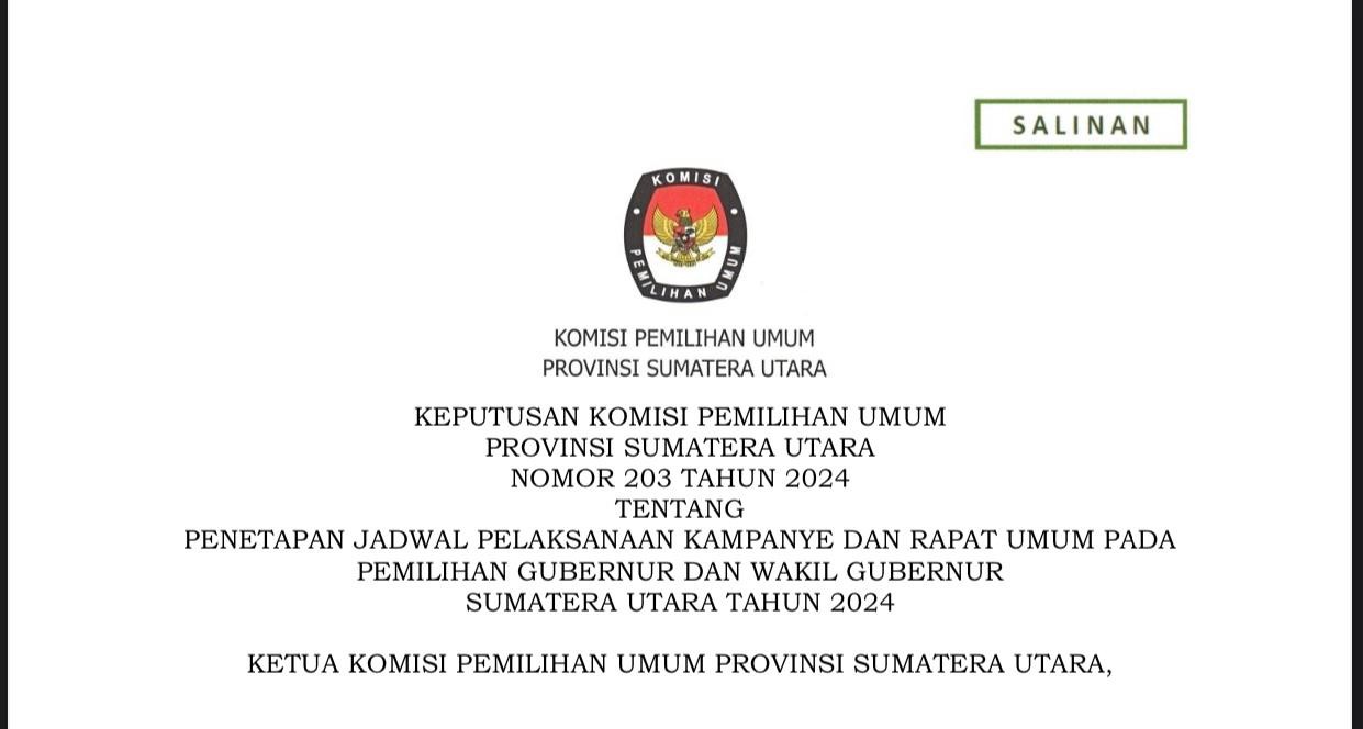Keputusan Komisi Pemilihan Umum Provinsi Sumatera Utara Nomor 203 Tahun 2024 Tentang Penetapan Jadwal Kampanye dan Rapat Umum Selasa, 24 September 2024 21:50 230 LINK DOWNLOAD Baca Selengkapnya