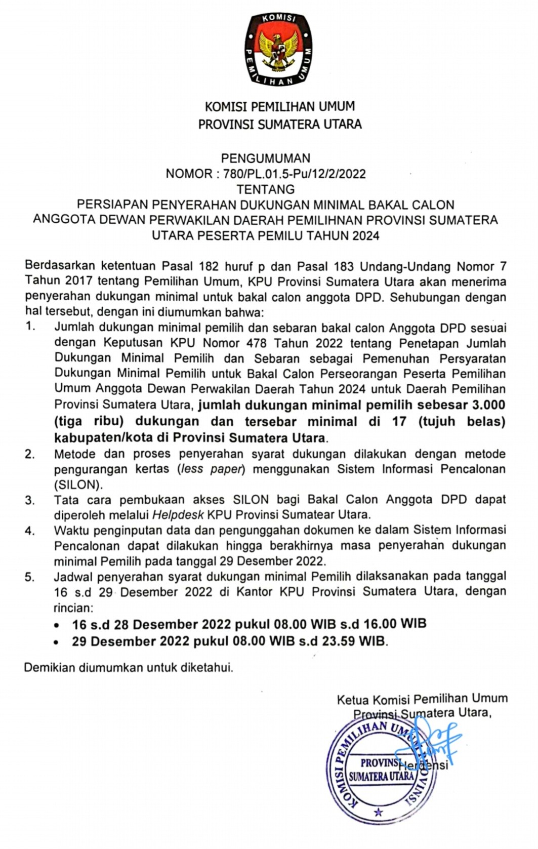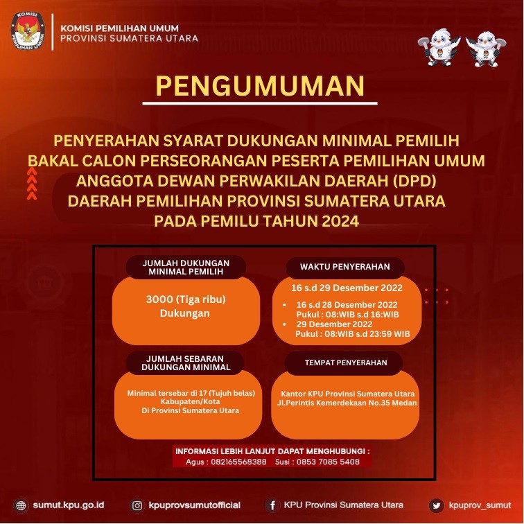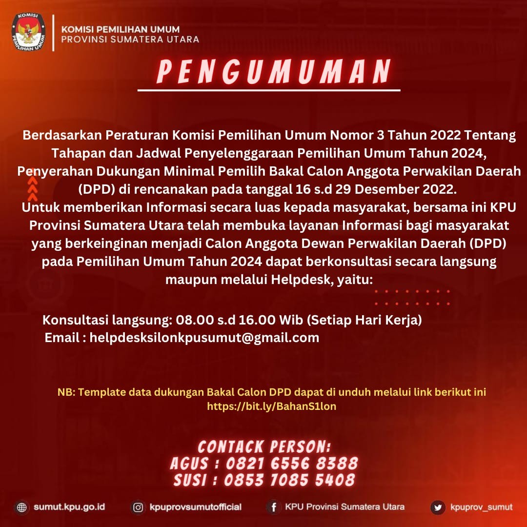 Pengumuman Penyerahan Dukungan Minimal Bakal Calon Anggota Dewan Perwakilan Daerah Senin, 05 Desember 2022 14:00 147 Baca Selengkapnya