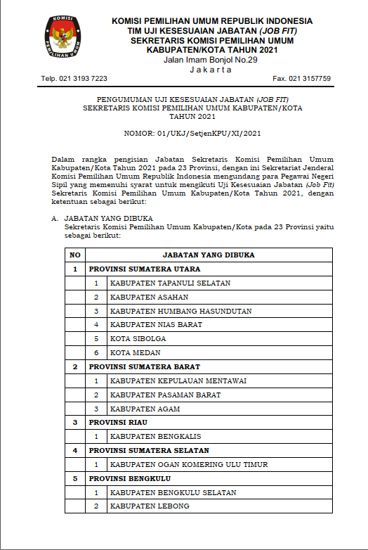 Pengumuman Uji Kesesuian Jabatan (Job Fit) Sekretaris Komisi Pemilihan Umum Kabupaten/Kota Tahun 2021 Selasa, 30 November 2021 00:00 386 https://www.kpu.go.id/berita/baca/10171/pengumuman-uji-kesesuaian-jabatan-job-fit-sekretaris-kpu-kabupatenkota-tahun-2021 Baca Selengkapnya
