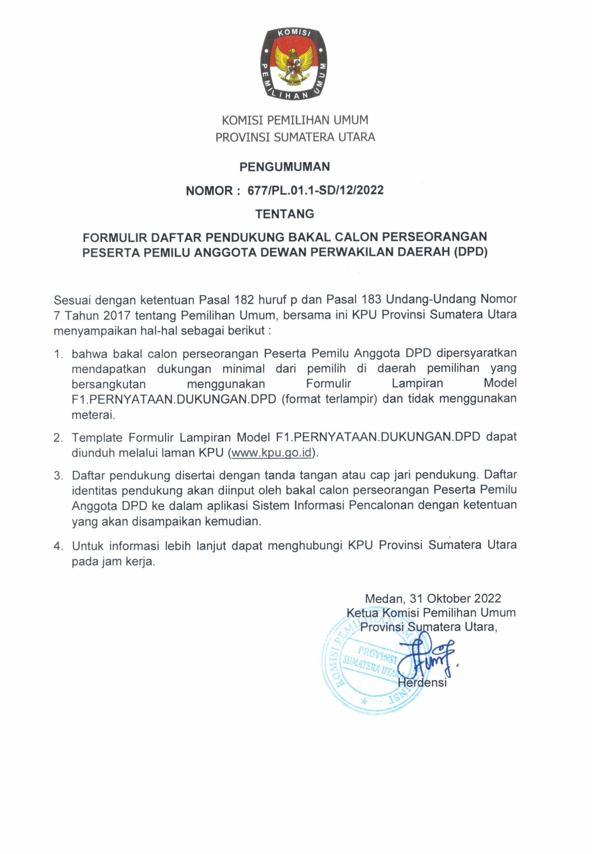 FORMULIR DAFTAR PENDUKUNG BAKAL CALON PERSEORANGAN PESERTA PEMILU ANGGOTA DEWAN PERWAKILAN DAERAH (DPD) Senin, 31 Oktober 2022 00:00 329 https://sumut.kpu.go.id/public/sumut/dmdocuments/1667233557677_PENGUMUMAN FORMULIR PENDUKUNG DPD.pdf Baca Selengkapnya