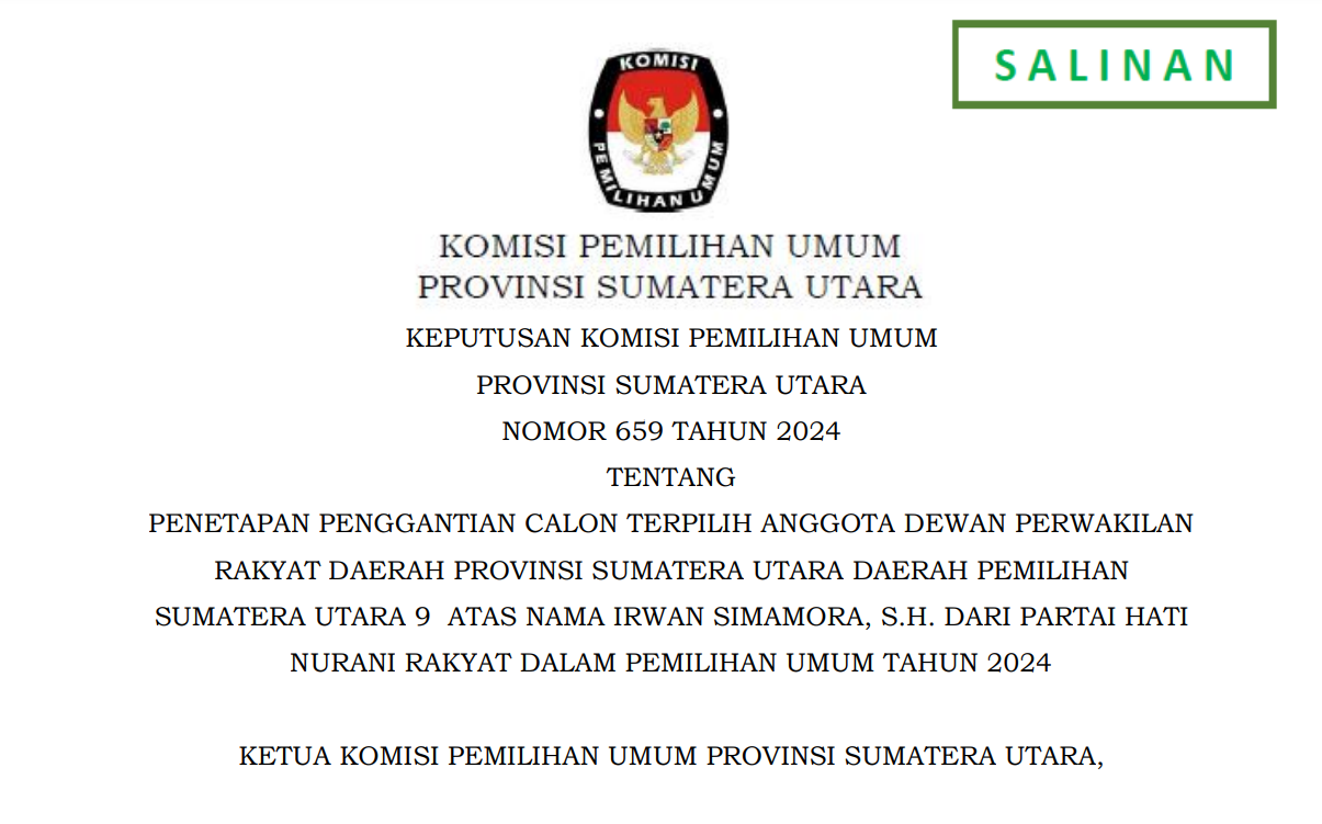 KEPUTUSAN KPU PROV. SUMATERA UTARA NOMOR 659 TAHUN 2024 TENTANG PENETAPAN PENGGANTIAN CALON TERPILIH ANGGOTA DPRD PROVINSI SUMATERA UTARA DAERAH PEMILIHAN SUMATERA UTARA 9 Selasa, 25 Juni 2024 22:01 37 FILE DOWNLOAD DISINI Baca Selengkapnya