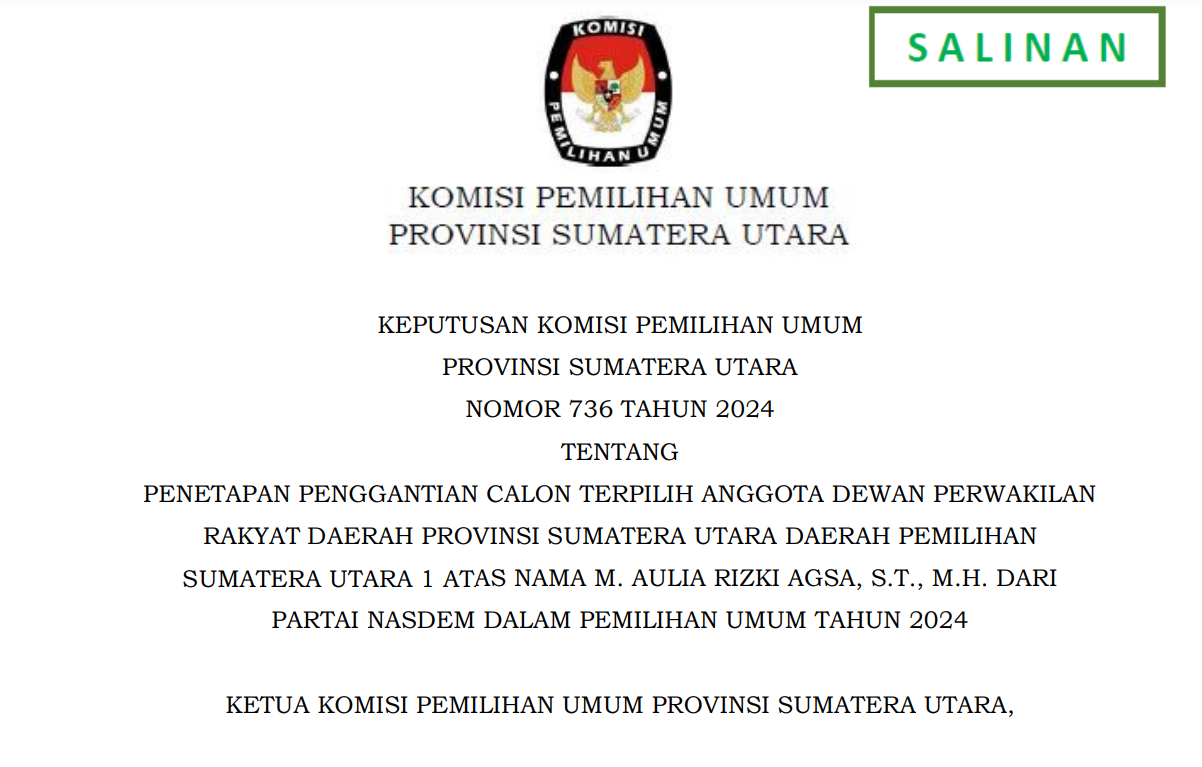 KEPUTUSAN KPU PROV.SUMATERA UTARA NOMOR 736 TAHUN 2024 TENTANG PENETAPAN PENGGANTIAN CALON TERPILIH ANGGOTA DPRD PROVINSI SUMATERA UTARA DAERAH PEMILIHAN SUMATERA UTARA 1 Selasa, 16 Juli 2024 21:30 264 LINK DOWNLOAD Baca Selengkapnya