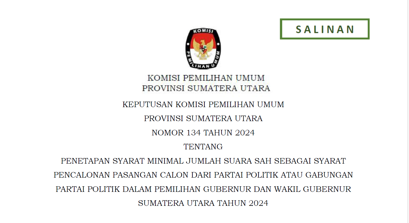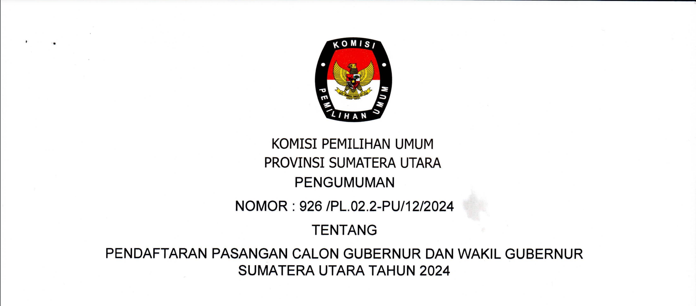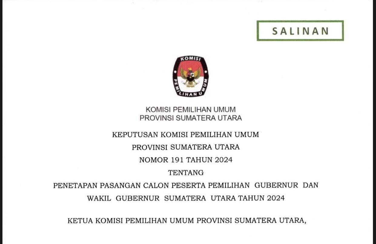 Keputusan Komisi Pemilihan Umum Provinsi Sumatera Utara Nomor 191 Tahun 2024 Tentang Penetapan Pasangan Calon Peserta Pemilihan Gubernur dan Wakil Gubernur Sumatera Utara Tahun 2024 Minggu, 22 September 2024 19:20 72 LINK DOWNLOAD Baca Selengkapnya