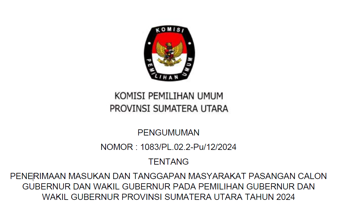 Pengumuman KPU Sumut Nomor 1083 Tentang Penerimaan Masukan dan Tanggapan Masyarakat Pasangan Calon Gubernur dan Wakil Gubernur Pada Pilgub Sumatera Utara 2024 Sabtu, 14 September 2024 16:10 1201 LINK DOWNLOAD Baca Selengkapnya