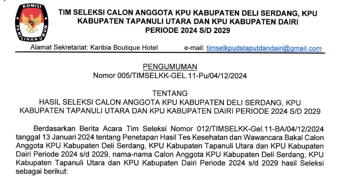 PENGUMUMAN HASIL SELEKSI CALON ANGGOTA KPU KABUPATEN DELISERDANG, TAPANULI UTARA DAN DAIRI PERIODE 2024 -2029 Senin, 15 Januari 2024 23:39 507 LINK DOWNLOAD Baca Selengkapnya