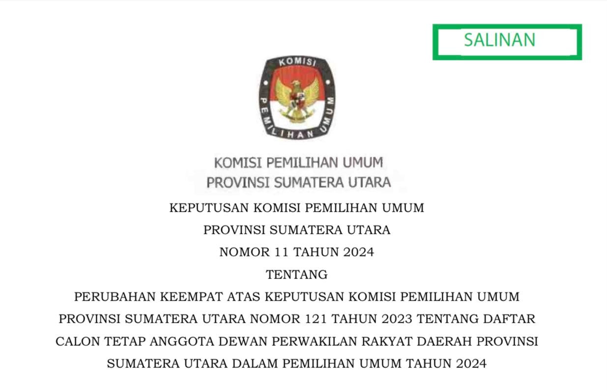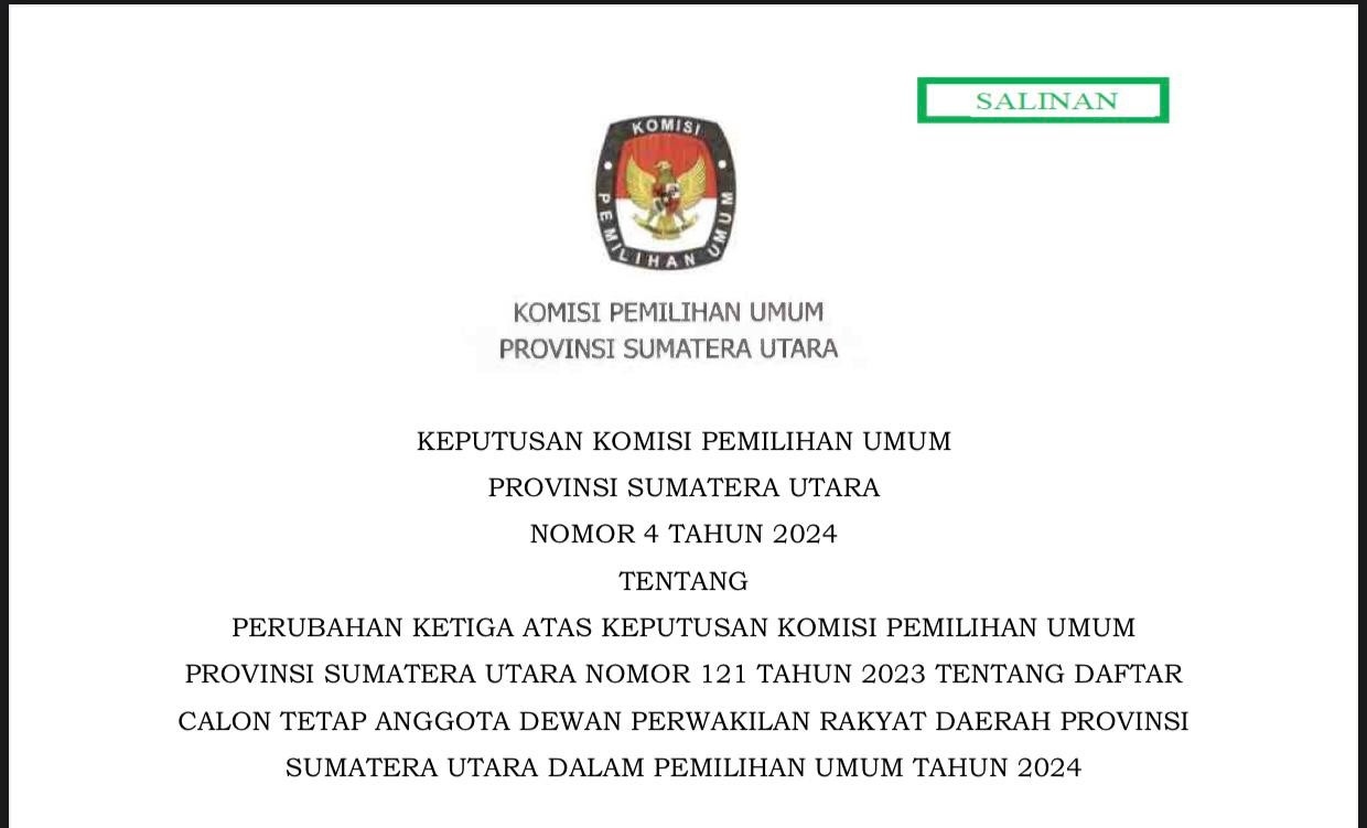 Keputusan Komisi Pemilihan Umum Provinsi Sumatera Utara Nomor 11 Tahun 2024 Tentang Perubahan Keempat Daftar Calon Tetap Anggota DPRD Provinsi Sumatera Utara Kamis, 01 Februari 2024 08:12 1302 LINK DOWNLOAD Baca Selengkapnya