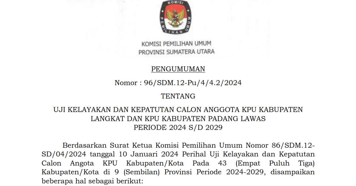 PENGUMUMAN NOMOR 96/SDM.12-Pu/4/4.2/2024 UJI KELAYAKAN DAN KEPATUTAN CALON ANGGOTA KPU KABUPATEN LANGKAT DAN KPU KABUPATEN PADANG LAWAS PERIODE 2024 - 2029 Minggu, 21 Januari 2024 23:00 283 LINK DOWNLOAD Baca Selengkapnya