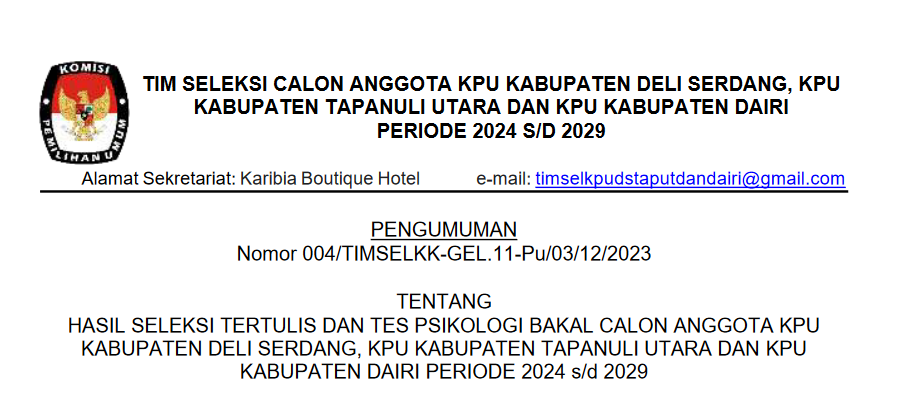 PENGUMUMAN NOMOR 004/TIMSELKK-GEL.11-Pu/03/12/2023 TENTANG HASIL SELEKSI TERTULIS DAN TES PSIKOLOGI BAKAL CALON ANGGOTA KPU KABUPATEN DELISERDANG , TAPANULI UTARA, DAIRI PERIODE 2024 S.D 2029 Senin, 01 Januari 2024 12:46 590 LINK DOWNLOAD Baca Selengkapnya
