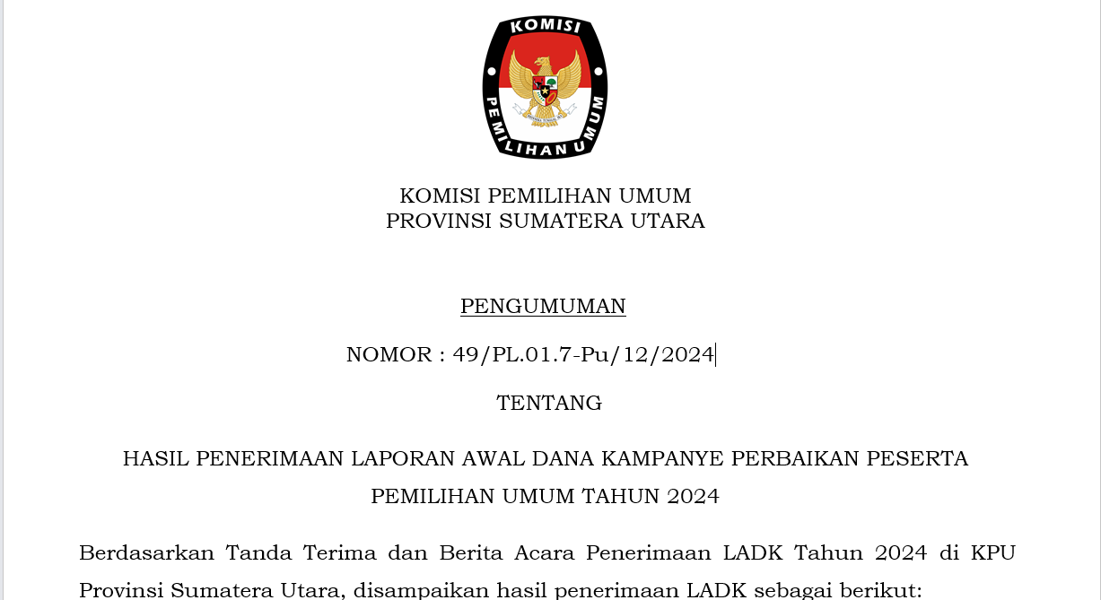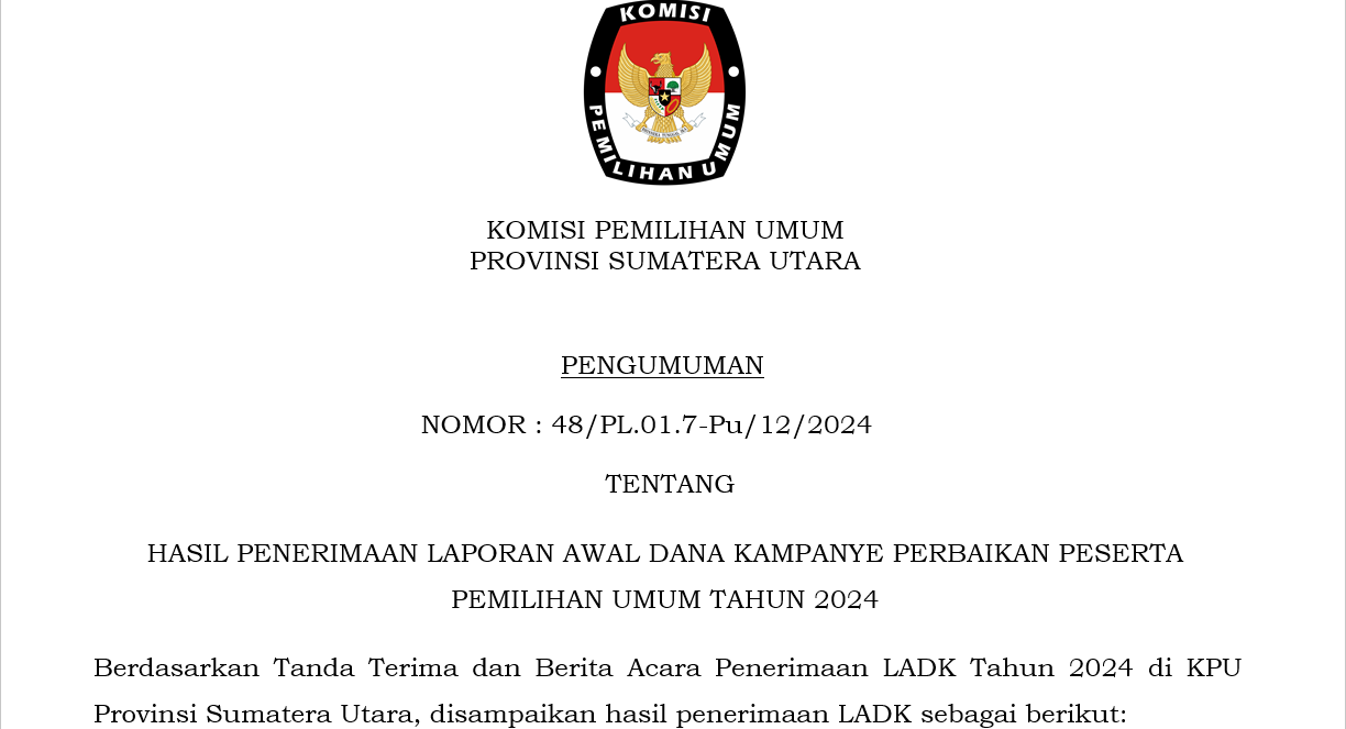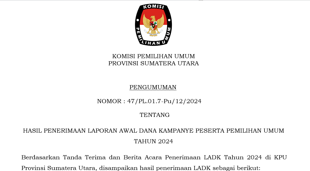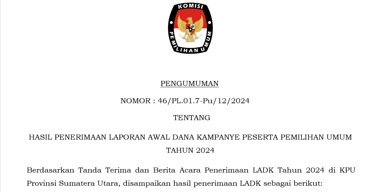 PENGUMUMAN LAPORAN AWAL DANA KAMPANYE (LADK) PARTAI POLITIK PESERTA PEMILU TAHUN 2024 TINGKAT PROVINSI SUMATERA UTARA Sabtu, 13 Januari 2024 21:19 17 LINK DOWNLOAD Baca Selengkapnya